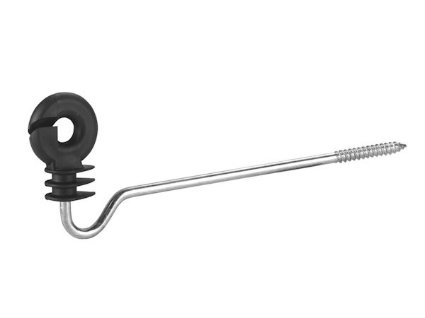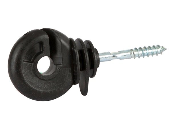 Black plastic ring insulator with wood thread. Bucket of 100 comes with a drive tool.